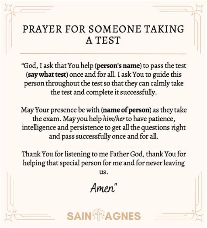 Question 2: What should I pray for before a test?There is no right or wrong way to pray before a test. You can pray for whatever you feel comfortable praying for. Some common things to pray for include: